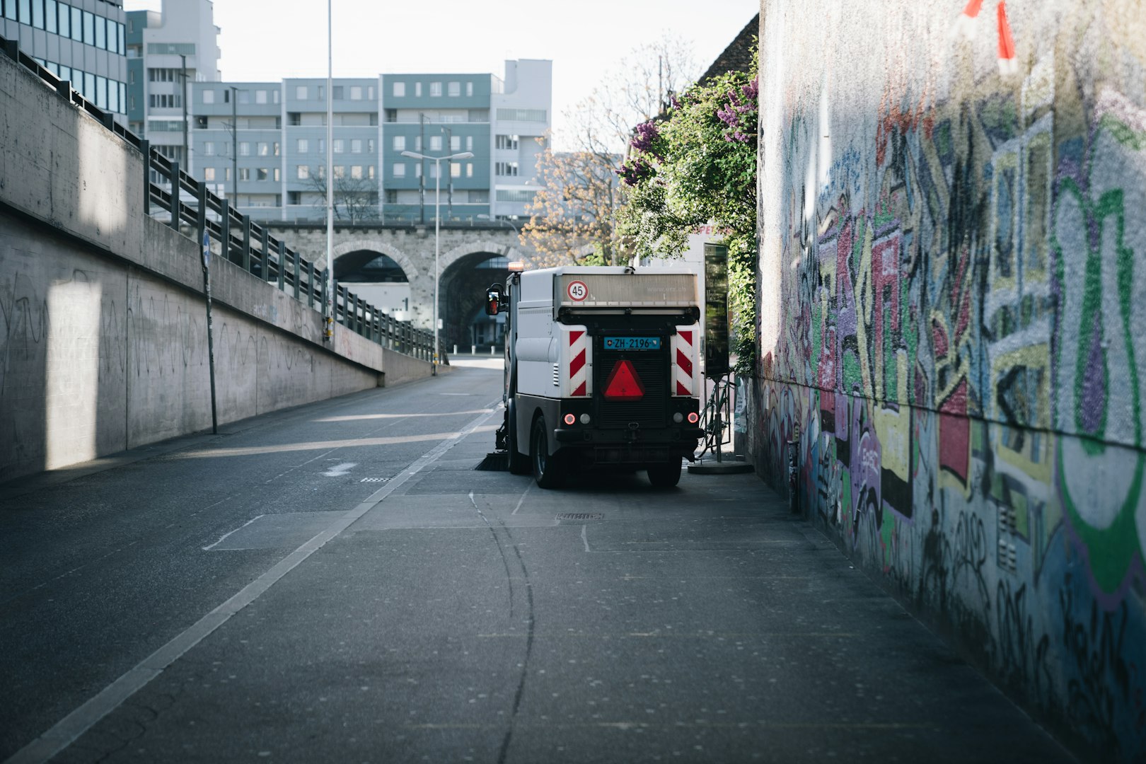 Ogräsborste och skyltning på maskin för arbete på väg.